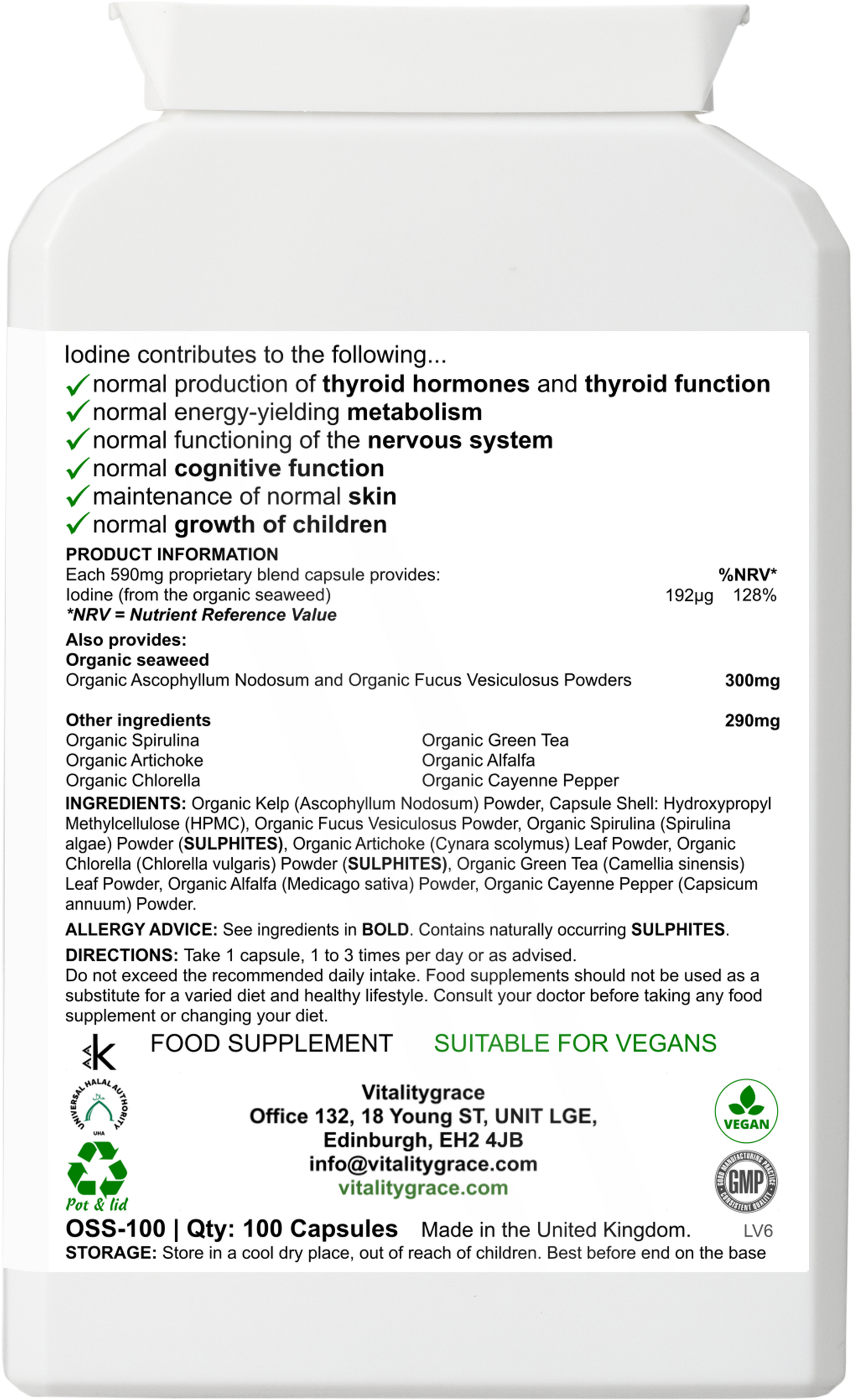 Component Source Organic Seaweed Ascophyllum nodosum & Fucus vesiculosus Organic Spirulina Spirulina algae Organic Artichoke Cynara scolymus leaf Organic Chlorella Chlorella vulgaris Organic Green Tea Camellia sinensis leaf Organic Ashwagandha Withania somnifera root Organic Cayenne Pepper Capsicum annuum Iodine content: 192µg per capsule (128% NRV)