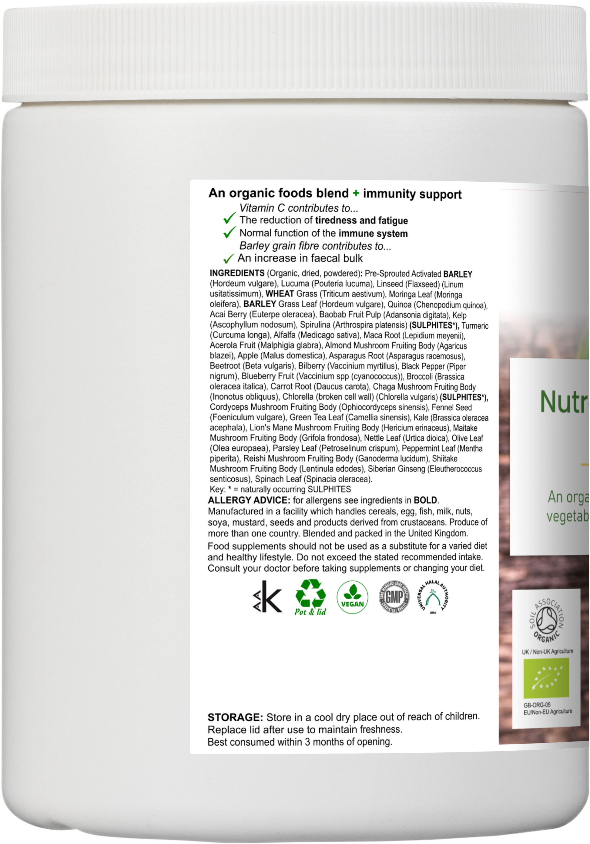Pre-sprouted activated barley, wheatgrass, barley grass leaf, alfalfa, spirulina, chlorella, kelp (Ascophyllum), nettle, olive leaf, parsley, green tea, peppermint, moringa, Siberian ginseng, turmeric, black pepper